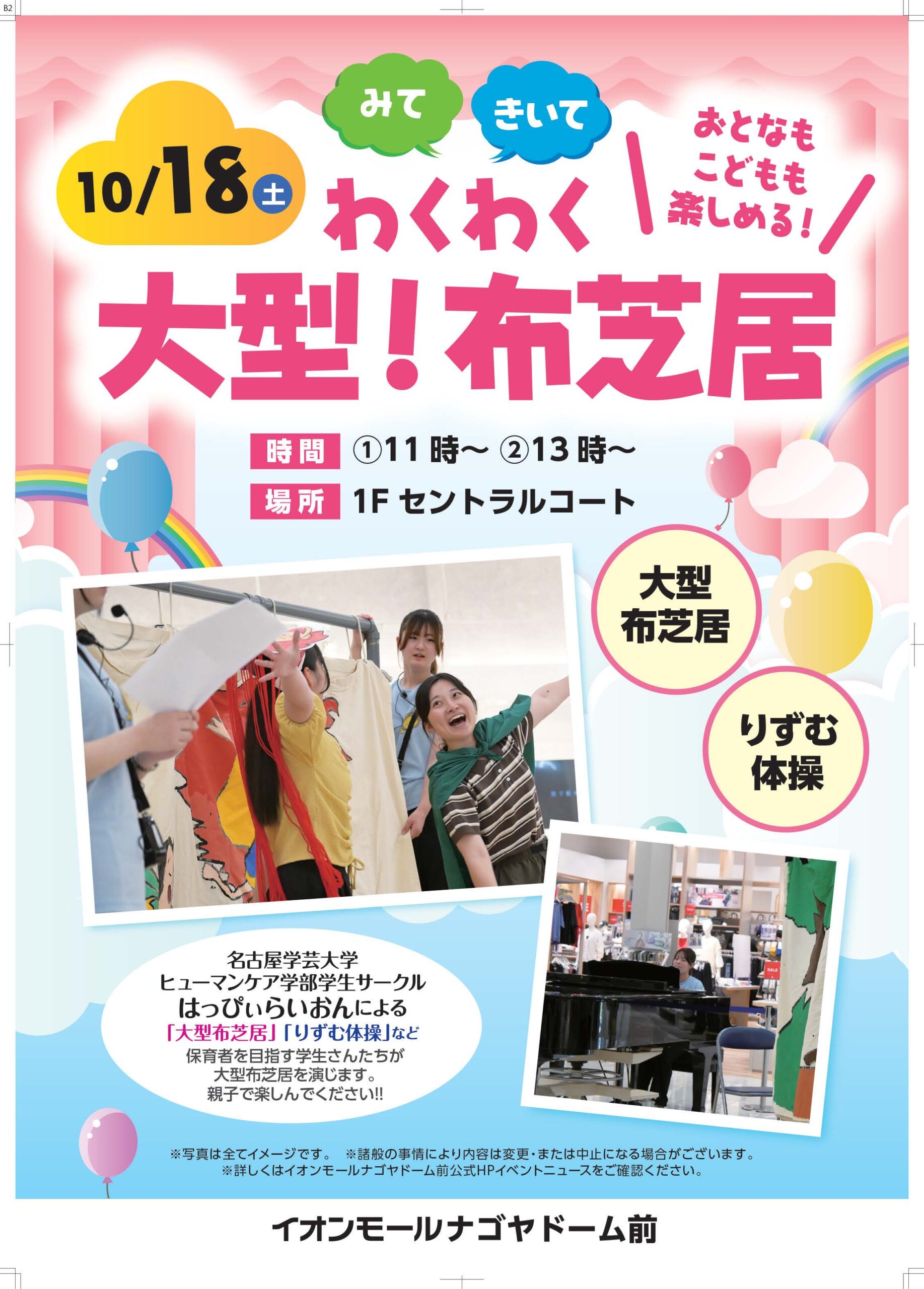 2025年10月18日(土)、イオンモールナゴヤドーム前 1Fセントラルコートにて、名古屋学芸大学 ヒューマンケア学部 幼児保育専攻のボランティアサークル【はっぴぃらいおん】による「大型布芝居」が上演されます。
