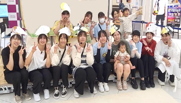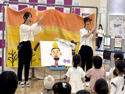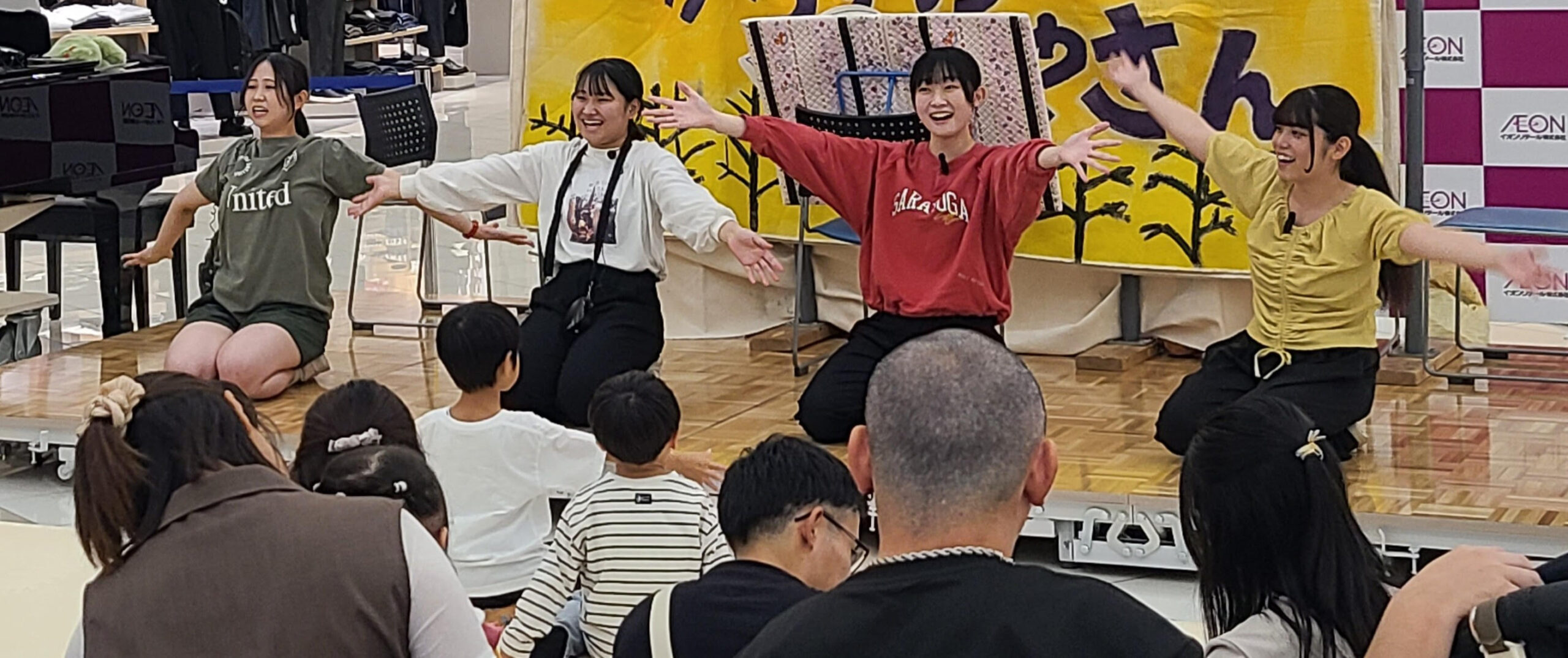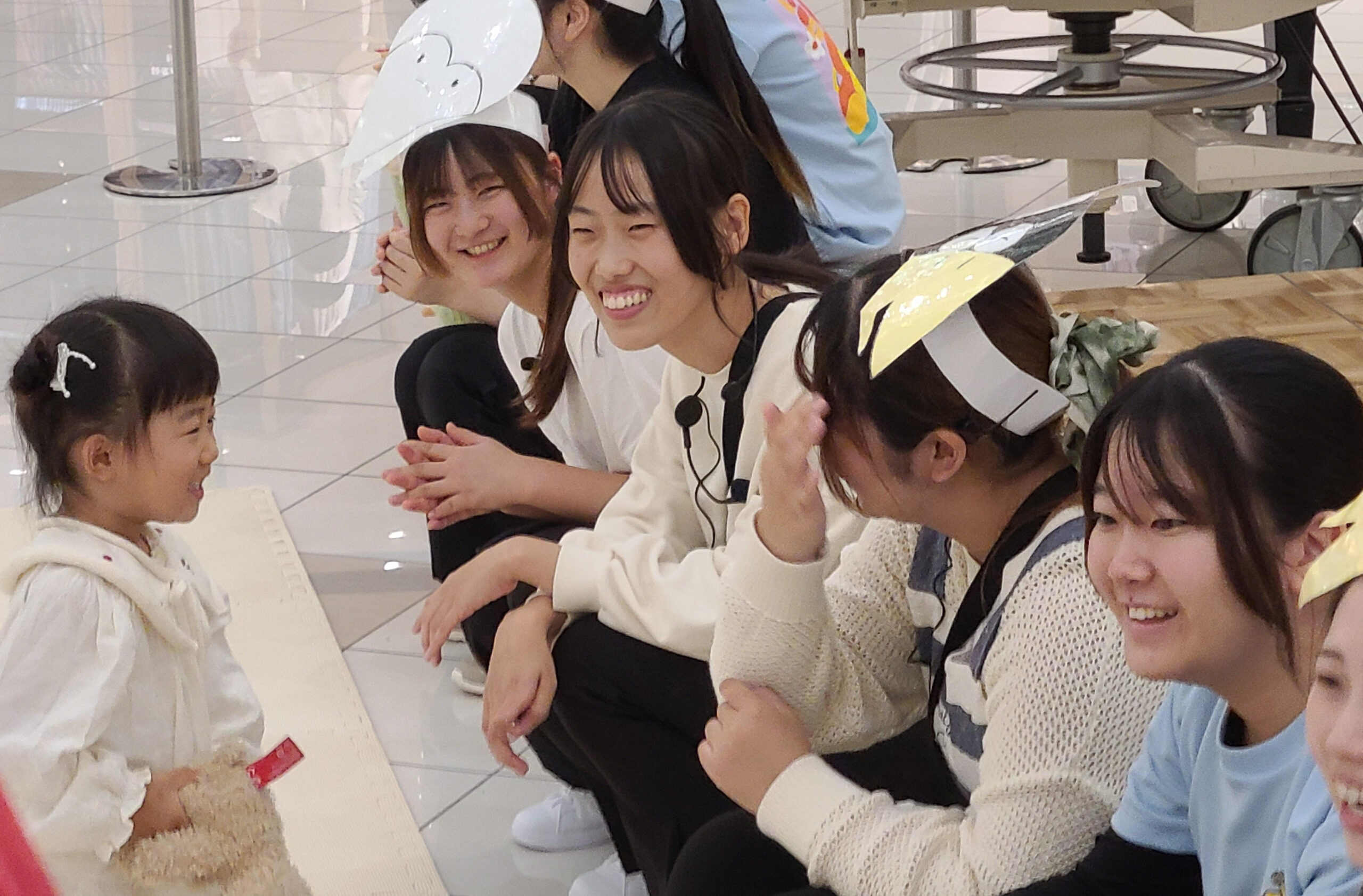 2025年10月18日(土)、イオンモールナゴヤドーム前にて、ヒューマンケア学部幼児保育専攻のボランティアサークル【はっぴぃらいおん】による「大型布芝居」と手遊び・リズム体操を実践しました。
