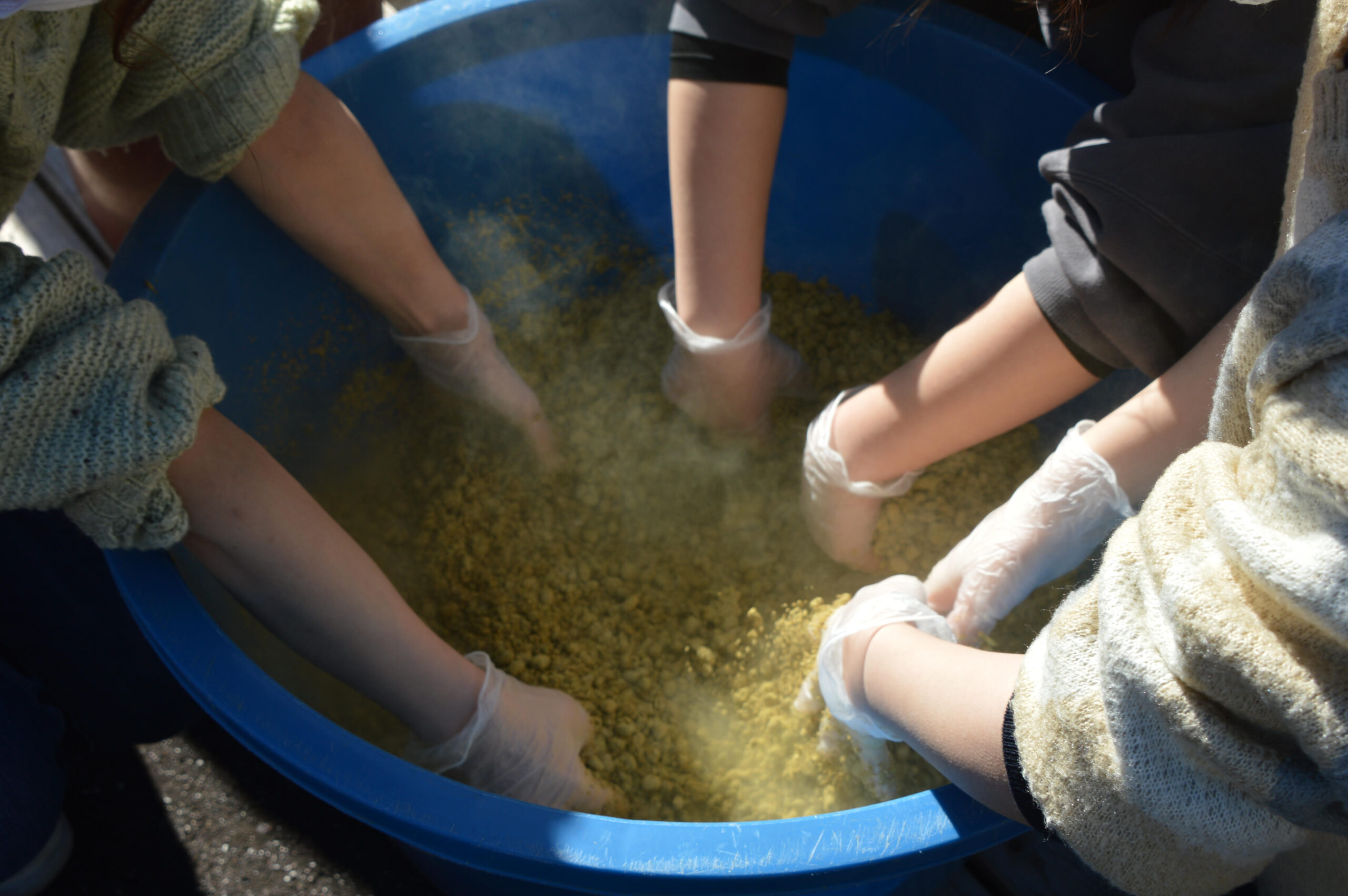 その後、赤味噌の仕込み作業に挑戦しました。味噌は一年後に完成する予定です。