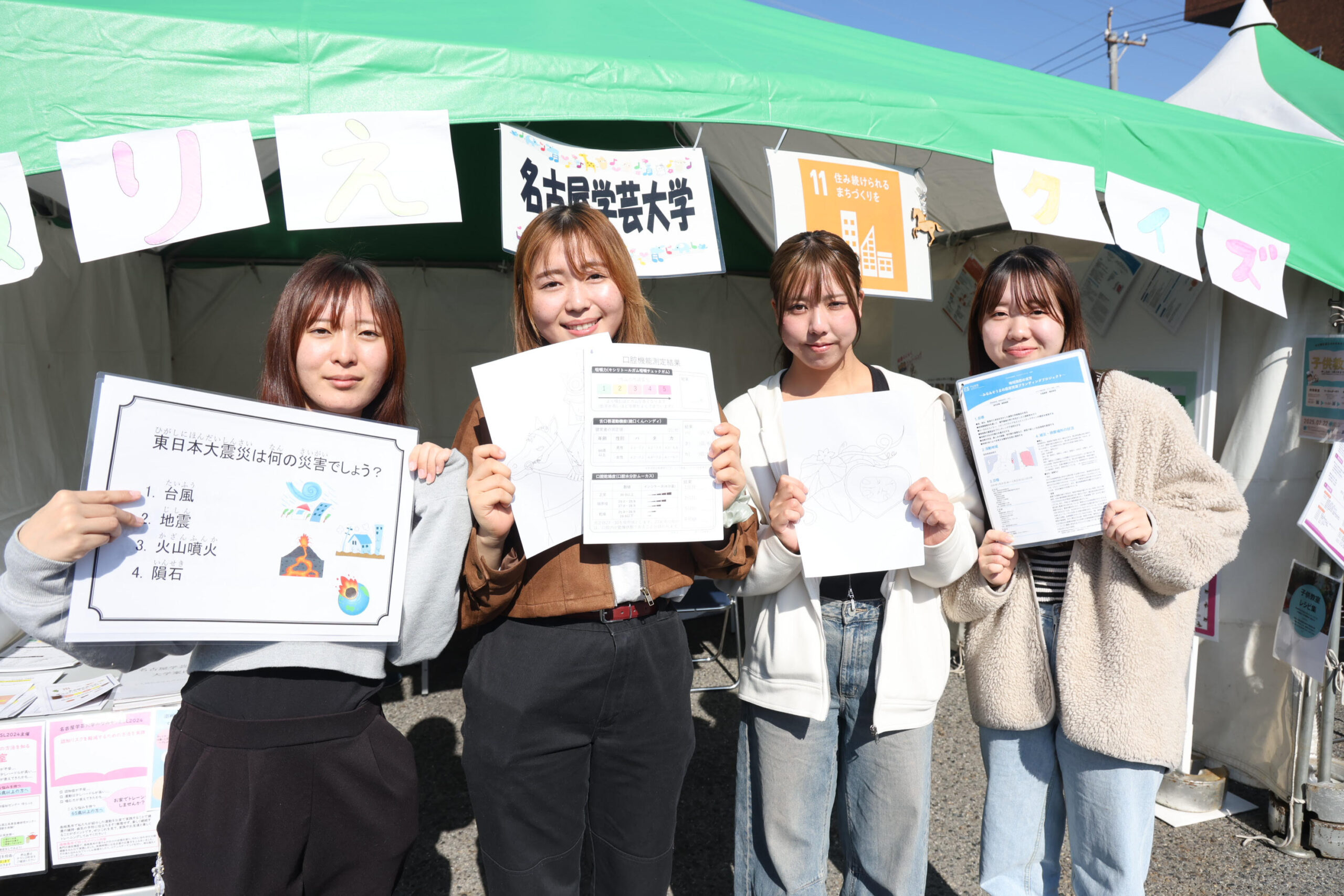 11月18日(日)に、日進市役所周辺で開催された「第26回にっしん市民まつり」の大学連携ブースに出展しました。みなみそうまSL2024に参加した学生4名がブースを担当し、これまでの活動をまとめたミニパネル展示や、「ぼうさいこくたい2025」で使用した掲示物を活用した報告を行いました。
